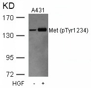 | Verified Activity | 1. Western blot analysis of extracts from A431 cells untreated or treated with HGF using Met (Phospho-Tyr1234) Antibody TMAC-02571. ![]() |