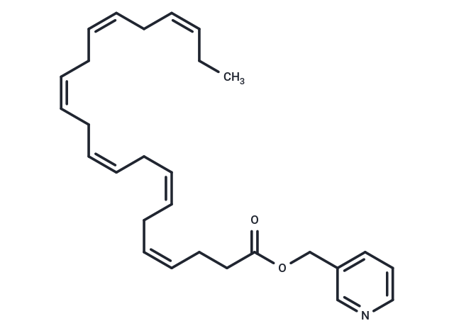 | In vivo | Treatment with F 16915 has no significant effect on body weight: 27.7±2.9 kg and 28.1±1.0 kg before surgery versus 29.2±3.4 kg and 28.8±1.7 kg after in the 1 and 5 g/day groups, respectively.?F 16915 administered at 5 g/day for 4 weeks significantly reduces the mean duration of Atrial fibrillation (AF) induced by burst pacing but has no significant effect at 1 g/day.?The duration of AF is significantly reduced from 989±111 s in the placebo group to 79±59 s in the presence of F 16915 at 5 g/day.?Treatment of 2 months with 100 mg/kg F 16915 also significantly reduces the infarct size.F 16915 is a docosahexaenoic acid derivative which can prevent heart failure-induced atrial fibrillation. Time-dependent changes in blood concentrations of total docosahexaenoic acid (DHA) and nicotinyl alcohol are followed after a single oral administration of F 16915 (300 mg/kg) to male rats. |