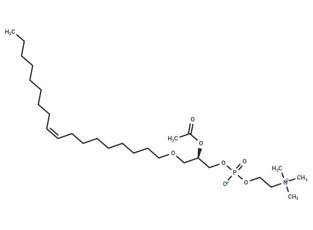 | Description | PAF C-18:1 is a naturally occurring phospholipid produced by cells upon stimulation and plays a role in the establishment and maintenance of the inflammatory response. It is less potent than PAF C-16 and PAF C-18 in the induction of neutrophil chemotaxis, but is equipotent to PAF C-16 and PAF C-18 in promoting eosinophil migration. PAF C-18:1 activates the PAF receptor and has been used in antibody binding experiments to determine the importance of an acyl linkage at the sn-2 position for recognition at this receptor. |