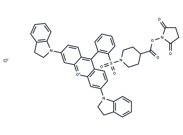 QSY 21 NHS is an effective energy transfer acceptor for far-red and near-infrared fluorescent probes. This quencher operates within the wavelength range of 540-750 nm, typically utilized in FRET applications. QSY 21 NHS does not emit fluorescence under normal conditions. The NHS ester form of QSY 21 allows for the labeling of proteins, amine-modified oligonucleotides, and other primary amine-containing molecules (R-NH2).