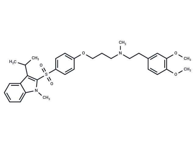 SR-33805 is a calcium channel antagonist potentially for the treatment of atherosclerosis and heart failure. SR-33805 restored the MI-altered cell shortening without affecting the Ca(2+) transient amplitude, suggesting an increase of myofilament Ca(2+) sensitivity in MI myocytes. A SR33805-induced sensitization of myofilament activation was found to be associated with a slight increase in myosin light chain-2 phosphorylation and a more significant decrease on troponin I (TnI) phosphorylation. Decreased TnI phosphorylation was related to inhibition of protein kinase A activity by SR-33805.