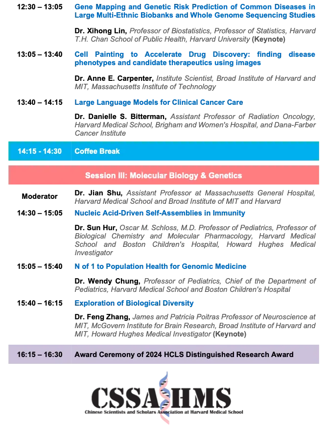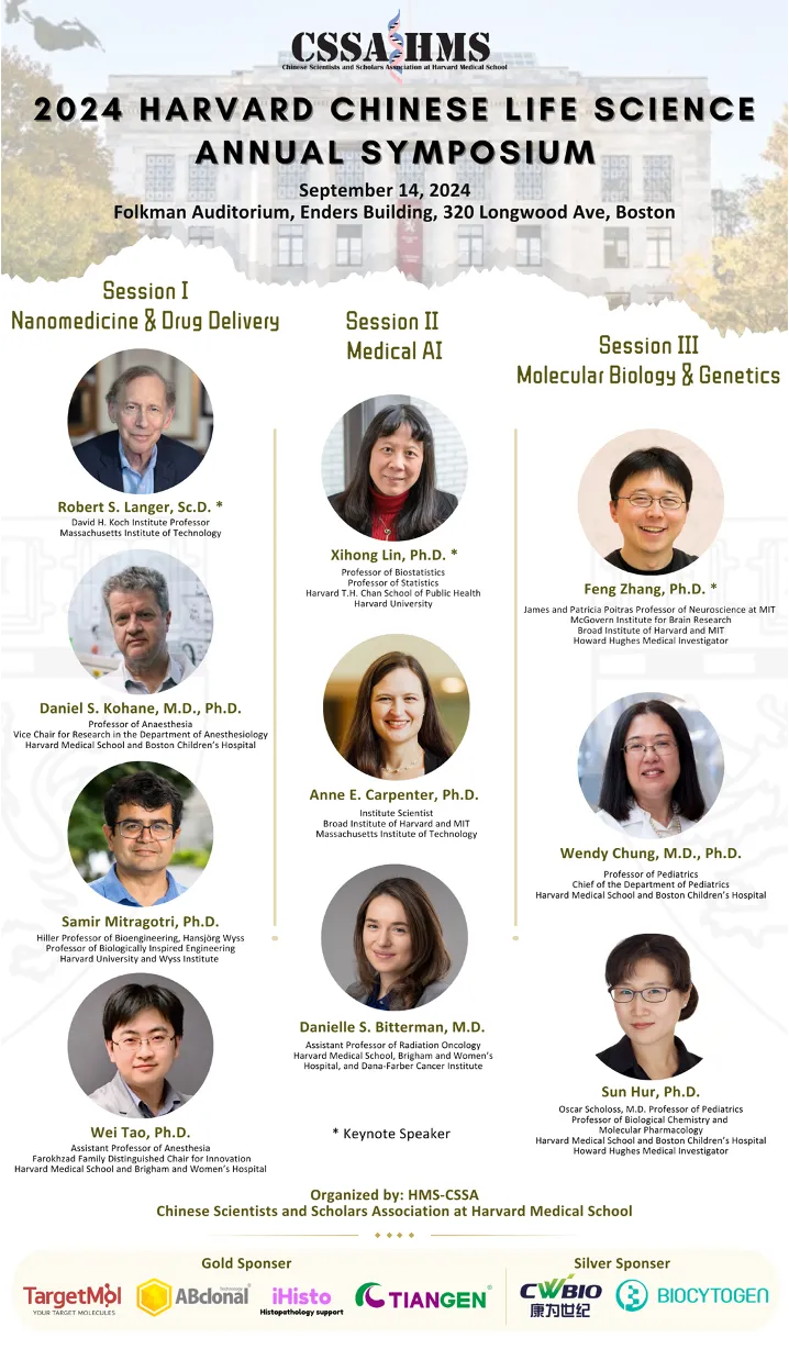 The Harvard Chinese Life Science Annual Symposium (HCLS) is the signature event organized by HMS-CSSA. The symposium covers basic life science research, translational medicine and biopharmaceutical industries. It draws hundreds of attendees working in life science-related areas in the U.S and China. This year, the symposium will be held on Saturday September 14th in the Folkman Auditorium, Enders Building, Boston Children’s Hospital. National speakers include world-renowned principal investigators and scientists in their respective fields. The symposium has 3 sessions, including Nanomedicine & Drug Delivery, Medical AI, and Molecular Biology & Genetics.