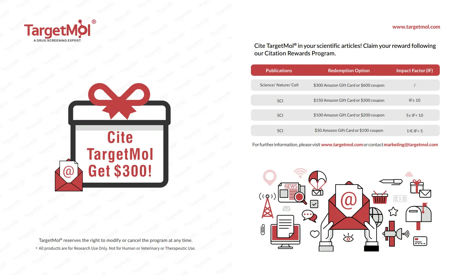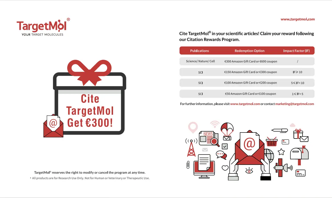Cite TargetMol in your scientific article to redeem up to $300/€300 Amazon gift card and $600/€600 coupon!