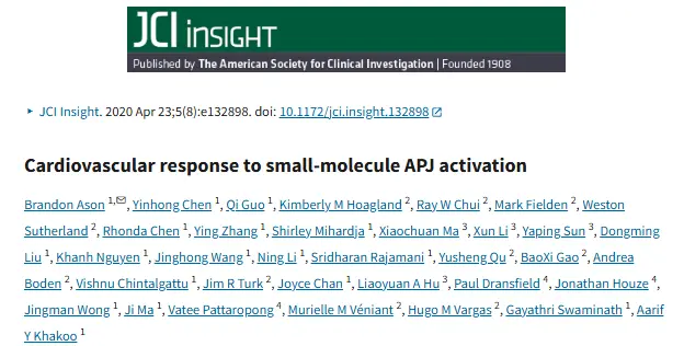 [4] Ason B, Chen Y, Guo Q, et al. Cardiovascular response to small-molecule APJ activation. JCI Insight. 2020 Apr 23;5(8):e132898. doi: 10.1172/jci.insight.132898. PMID: 32208384; PMCID: PMC7205427.