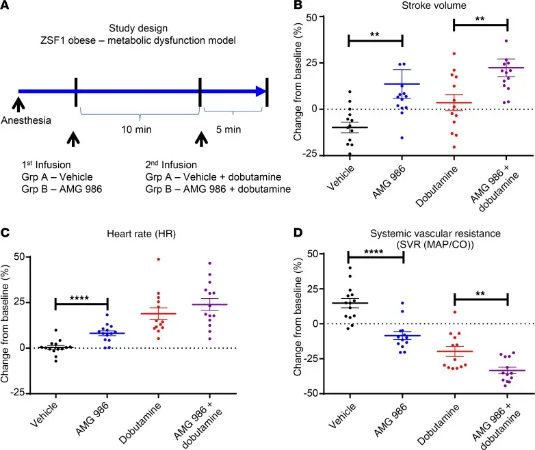 In this study, AMG 986 was administered to ZSF1 obese rat models to evaluate the effects of APJ activation on cardiac function. AMG 986 was infused at a rate of 1 mg/kg/min for 10 minutes, followed by a 5-minute co-infusion with dobutamine (12 μg/kg/min) to assess cardiac reserve function. AMG 986 reduced the MAP/cardiac output ratio, indicating a decrease in cardiac afterload.