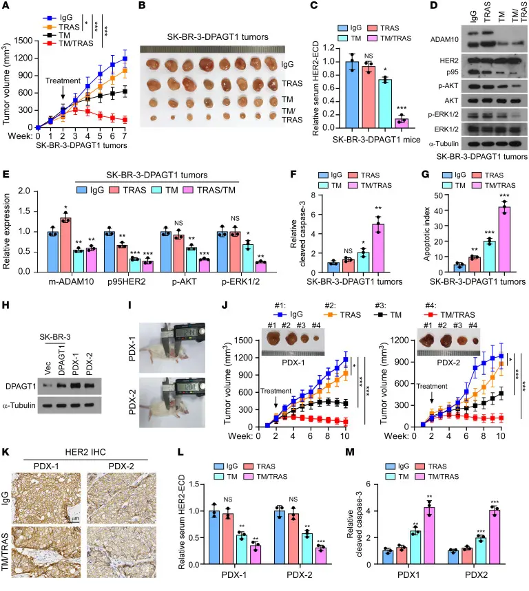 This study found that upregulation of dolichol-phosphate N-acetylglucosamine transferase (DPAGT1) sustains high levels of HER2 shedding, thereby leading to resistance to Trastuzumab. Following Trastuzumab treatment, membrane-associated DPAGT1 undergoes endocytosis via the caveolae pathway and is retrogradely transported to the endoplasmic reticulum (ER). In the ER, DPAGT1 promotes N-glycosylation of the sheddase ADAM10, ensuring its proper expression, maturation, and activation. N-glycosylation of ADAM10 at the N267 site protects it from ER-associated degradation, and this modification is critical for DPAGT1-mediated HER2 shedding and Trastuzumab resistance. Inhibition of DPAGT1 with tunicamycin, when combined with Trastuzumab, synergistically blocks HER2 signaling and reverses resistance. These findings reveal an important molecular mechanism underlying HER2 shedding and suggest that targeting DPAGT1 may represent a promising strategy to overcome Trastuzumab resistance in breast cancer. [5]