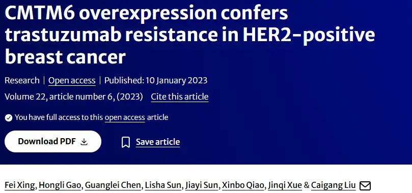 [4] Xing F, Gao H, Chen G, et al. CMTM6 overexpression confers trastuzumab resistance in HER2-positive breast cancer. Mol Cancer. 2023 Jan 10;22(1):6. doi: 10.1186/s12943-023-01716-y. Erratum in: Mol Cancer. 2024 Jan 5;23(1):3. doi: 10.1186/s12943-023-01918-4. Erratum in: Mol Cancer. 2025 Apr 14;24(1):115. doi: 10.1186/s12943-025-02317-7. PMID: 36627608; PMCID: PMC9830830.