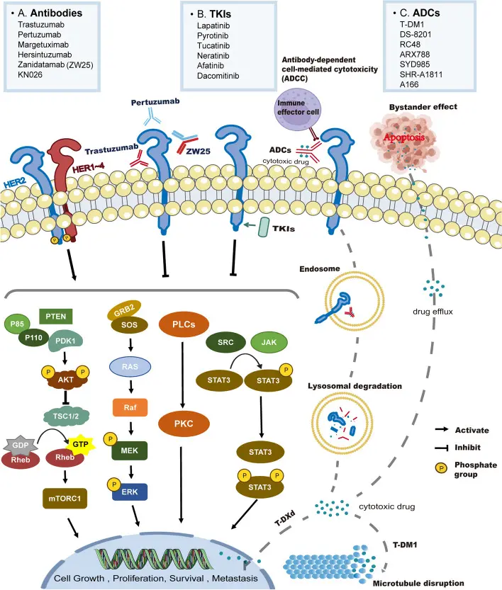 Aberrant alterations of HER2 (human epidermal growth factor receptor 2, also known as neu or erbB2) are closely associated with the initiation and progression of multiple cancers. HER2 has therefore become a key therapeutic target in oncology. Advances in molecular biology and deeper understanding of HER2-mediated signaling pathways have driven the development of drug design strategies and combination therapies. Current HER2-targeted therapeutics are broadly classified into antibodies, tyrosine kinase inhibitors (TKIs), and antibody–drug conjugates (ADCs), as illustrated in the figure. [1]