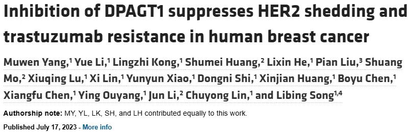 [5] Yang M, Li Y, Kong L, et al. Inhibition of DPAGT1 suppresses HER2 shedding and trastuzumab resistance in human breast cancer. J Clin Invest. 2023 Jul 17;133(14):e164428. doi: 10.1172/JCI164428. PMID: 37463446; PMCID: PMC10348774.