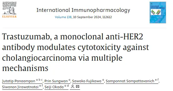 [3] Panaampon J, Sungwan P, Fujikawa S, et al. Trastuzumab, a monoclonal anti-HER2 antibody modulates cytotoxicity against cholangiocarcinoma via multiple mechanisms. Int Immunopharmacol. 2024 Sep 10;138:112612. doi: 10.1016/j.intimp.2024.112612. Epub 2024 Jul 4. PMID: 38968862.