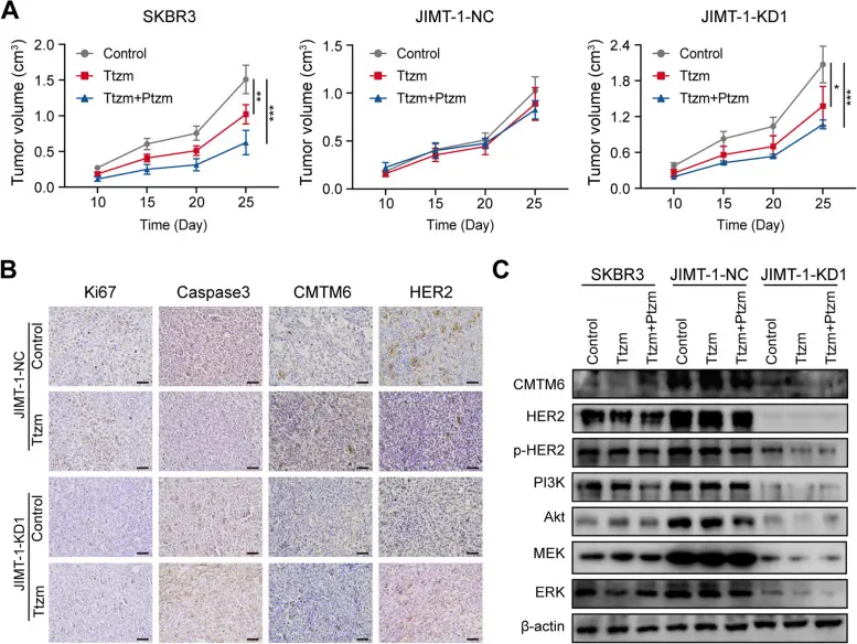 In this study, treatment with Trastuzumab alone significantly inhibited the growth of SKBR3 tumors and CMTM6-silenced JIMT-1 tumors, but had no effect on control JIMT-1 tumors with high CMTM6 expression. The combination of Pertuzumab further enhanced the therapeutic effect of Trastuzumab in SKBR3 and CMTM6-silenced JIMT-1 tumors. Compared with control JIMT-1 tumors, CMTM6-silenced JIMT-1 tumors showed markedly reduced expression of CMTM6, HER2, and Ki67 proteins, along with increased expression of caspase-3. In addition, the relative expression levels of CMTM6, HER2, p-HER2, PI3K, AKT, MEK, and ERK were decreased in CMTM6-silenced JIMT-1 tumors compared with controls, and this effect was more pronounced after Trastuzumab treatment. These data indicate that CMTM6 promotes Trastuzumab resistance in breast cancer by stabilizing HER2 protein and enhancing downstream signaling.
