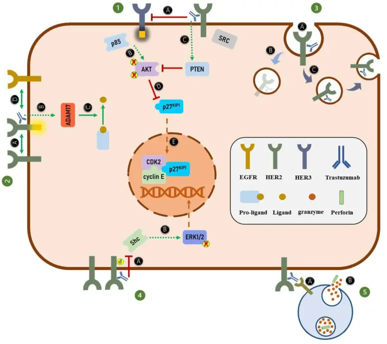 The antitumor activity of Trastuzumab is not mediated by a single pathway, but rather through the coordinated action of multiple mechanisms, including signaling pathway inhibition, regulation of receptor fate, and activation of immune effector functions. As shown in the figure, these mechanisms can be summarized into the following five aspects. [2]