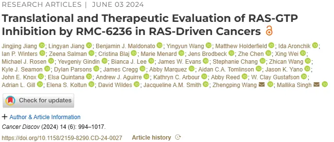 [4] Jiang J, Jiang L, Maldonato BJ, et al. Translational and Therapeutic Evaluation of RAS-GTP Inhibition by RMC-6236 in RAS-Driven Cancers. Cancer Discov. 2024 Jun 3;14(6):994-1017. doi: 10.1158/2159-8290.CD-24-0027. Erratum in: Cancer Discov. 2025 Oct 6;15(10):2186. doi: 10.1158/2159-8290.CD-25-1519. PMID: 38593348; PMCID: PMC11149917.