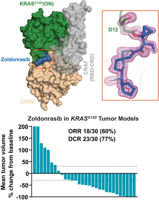 Zoldonrasib is a novel covalent inhibitor that promotes the formation of a stable, high-affinity tri-complex between Cyclophilin A and GTP-bound KRASG12X, thereby suppressing KRASG12X(ON) downstream signaling by sterically blocking the binding of effector proteins such as RAF, PI3K, and RALGDS. More than 90% of pancreatic ductal adenocarcinoma (PDAC) cases are driven by oncogenic KRAS mutations. KRAS mutations—particularly the predominant G12D mutation in PDAC—promote tumor initiation, progression, and immune evasion, leading to therapeutic resistance. Due to the low intrinsic reactivity of the Asp12 residue, KRASG12X has long been considered an “undruggable” target. However, this molecular glue–based mechanism enables effective inhibition of the active KRASG12X state and has demonstrated significant antitumor activity across multiple preclinical models, offering a new strategy to overcome the therapeutic challenges associated with KRASG12X -driven malignancies. [3]