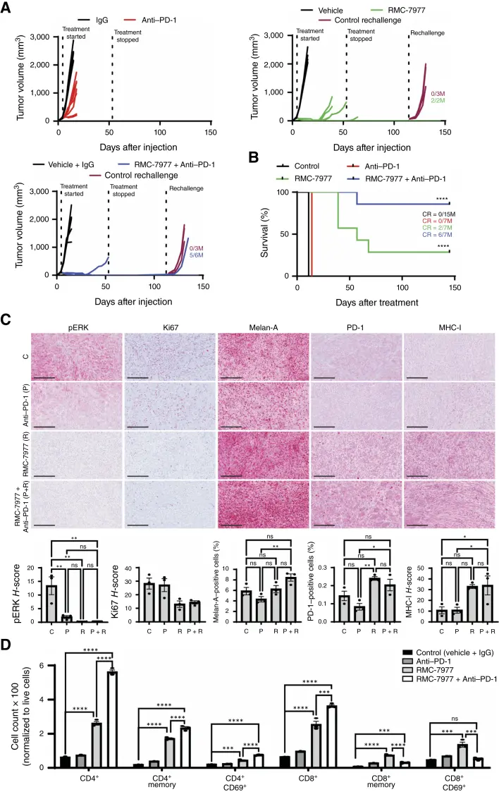 This study systematically elucidated the antitumor activity of RMC-7977 in NRAS-mutant melanoma mouse models. The results showed that the durable antitumor responses induced by RMC-7977 depended on the activation of CD4+ and CD8+ T cells and were accompanied by a reduction in the recruitment of myeloid-derived suppressor cells. Moreover, when combined with anti–PD-1 antibodies, RMC-7977 significantly prolonged survival and achieved complete tumor regression in preclinical models resistant to anti–PD-1 therapy.