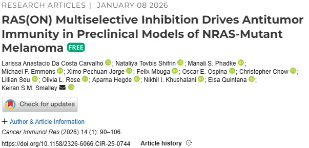 [5] Anastacio Da Costa Carvalho L, Tovbis Shifrin N, Phadke MS, et al. RAS(ON) Multiselective Inhibition Drives Antitumor Immunity in Preclinical Models of NRAS-Mutant Melanoma. Cancer Immunol Res. 2026 Jan 8;14(1):90-106. doi: 10.1158/2326-6066.CIR-25-0744. PMID: 41186497; PMCID: PMC12666865.