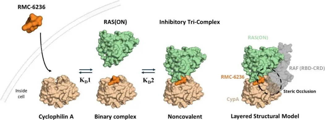 Daraxonrasib (RMC-6236), RMC-7977, and Zoldonrasib (RMC-9805) were all developed on the RAS(ON) tri-complex inhibitor platform pioneered by Revolution Medicines. This class of compounds leverages an induced-proximity mechanism to recruit oncogenic RAS proteins to the intracellular chaperone Cyclophilin A, thereby reshaping the surface topology of Cyclophilin A to form a high-affinity ternary complex that selectively recognizes the GTP-bound (active) state of RAS. This mechanism effectively creates a physical blockade that prevents RAS from interacting with downstream effectors such as RAF, thereby shutting down signal transduction. While the three compounds share a highly unified molecular mechanism, their differentiation lies primarily in target spectrum selectivity (e.g., RMC-6236 exhibits pan-RAS inhibitory activity across multiple RAS variants), enhanced chemical engagement strategies (e.g., RMC-9805 incorporates covalent modification to improve targeting durability toward KRASG12D), and distinct R&D positioning and functional roles (e.g., RMC-7977 serves as a mechanistic probe molecule to systematically characterize the coverage and biochemical effects of non-covalent ternary complex formation across multiple RAS(ON) subtypes).