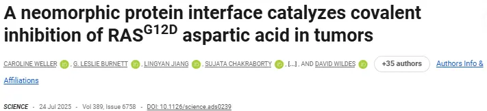 [3] Weller C, Burnett GL, Jiang L, et al. A neomorphic protein interface catalyzes covalent inhibition of RASG12D aspartic acid in tumors. Science. 2025 Jul 24;389(6758):eads0239. doi: 10.1126/science.ads0239. Epub 2025 Jul 24. PMID: 40705880.