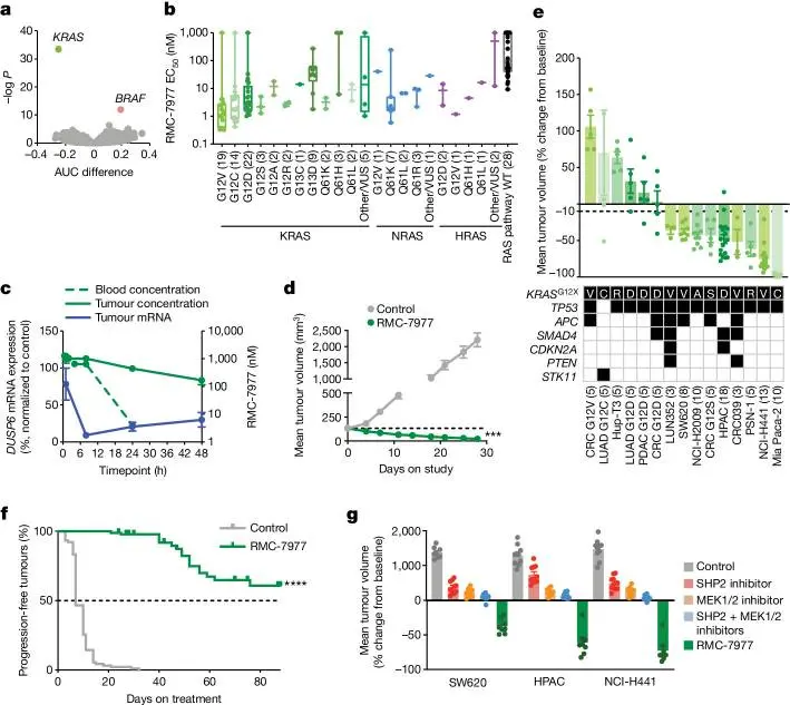 This study performed cell viability profiling (PRISM assay) across 869 human tumor cell lines with diverse genetic backgrounds and histological subtypes to identify genetic features associated with sensitivity or resistance to RMC-7977. Oncogenic KRAS mutation status emerged as an important genetic marker of sensitivity to RMC-7977. At a dose of 10 mg/kg administered daily, RMC-7977 was well tolerated in the NCI-H441 model, producing an average tumor regression of 83% after 28 days of treatment.