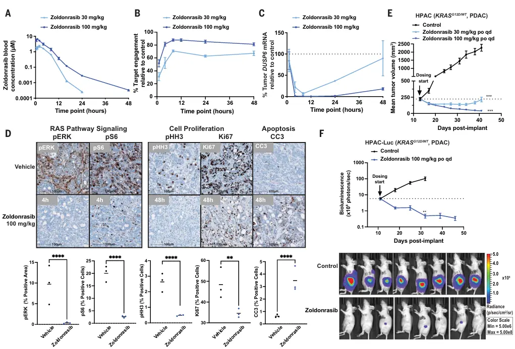 This study showed that, in the HPAC xenograft model, daily oral administration of Zoldonrasib achieved sufficient in vivo exposure and stable covalent target engagement with KRASG12D, leading to inhibition of the RAS/MAPK signaling pathway. Zoldonrasib was well tolerated in the model and exhibited marked dose-dependent antitumor activity, inducing up to 93% durable tumor regression.