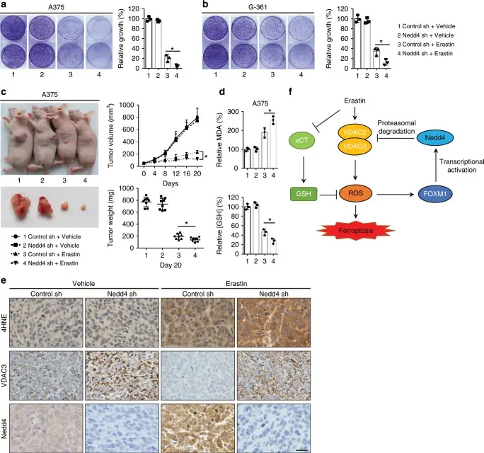 This study uncovers a novel regulatory mechanism of ferroptosis in melanoma cells: the E3 ubiquitin ligase Nedd4 ubiquitinates the mitochondrial outer membrane proteins VDAC2/3, reducing their stability and functional activity, thereby suppressing Erastin-induced ferroptosis. In melanoma models, high Nedd4 expression significantly attenuates Erastin-triggered ROS accumulation and lipid peroxidation, enhancing cellular resistance to ferroptosis. Conversely, inhibition or knockdown of Nedd4 restores VDAC2/3 function, rendering cells more sensitive to Erastin. By elucidating the molecular mechanism underlying cellular resistance to Erastin, the study reveals how cells adapt via novel molecules to maintain homeostasis. Moreover, the FOXM1–Nedd4–VDAC2/3 negative feedback loop mediating Erastin resistance provides a preliminary framework for overcoming resistance to ferroptosis inducers. [2]