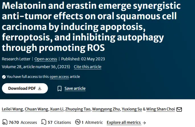 [3] Wang L, Wang C, Li X, et al. Melatonin and erastin emerge synergistic anti-tumor effects on oral squamous cell carcinoma by inducing apoptosis, ferroptosis, and inhibiting autophagy through promoting ROS. Cell Mol Biol Lett. 2023 May 2,28(1):36. doi: 10.1186/s11658-023-00449-6. PMID: 37131152, PMCID: PMC10155313.