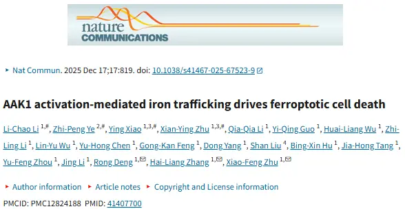 [4] Li LC, Ye ZP, Xiao Y, et al. AAK1 activation-mediated iron trafficking drives ferroptotic cell death. Nat Commun. 2025 Dec 17,17(1):819. doi: 10.1038/s41467-025-67523-9. PMID: 41407700, PMCID: PMC12824188.
