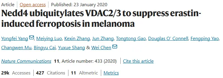 [2] Yang Y, Luo M, Zhang K, et al. Nedd4 ubiquitylates VDAC2/3 to suppress erastin-induced ferroptosis in melanoma. Nat Commun. 2020 Jan 23,11(1):433. doi: 10.1038/s41467-020-14324-x. PMID: 31974380, PMCID: PMC6978386.